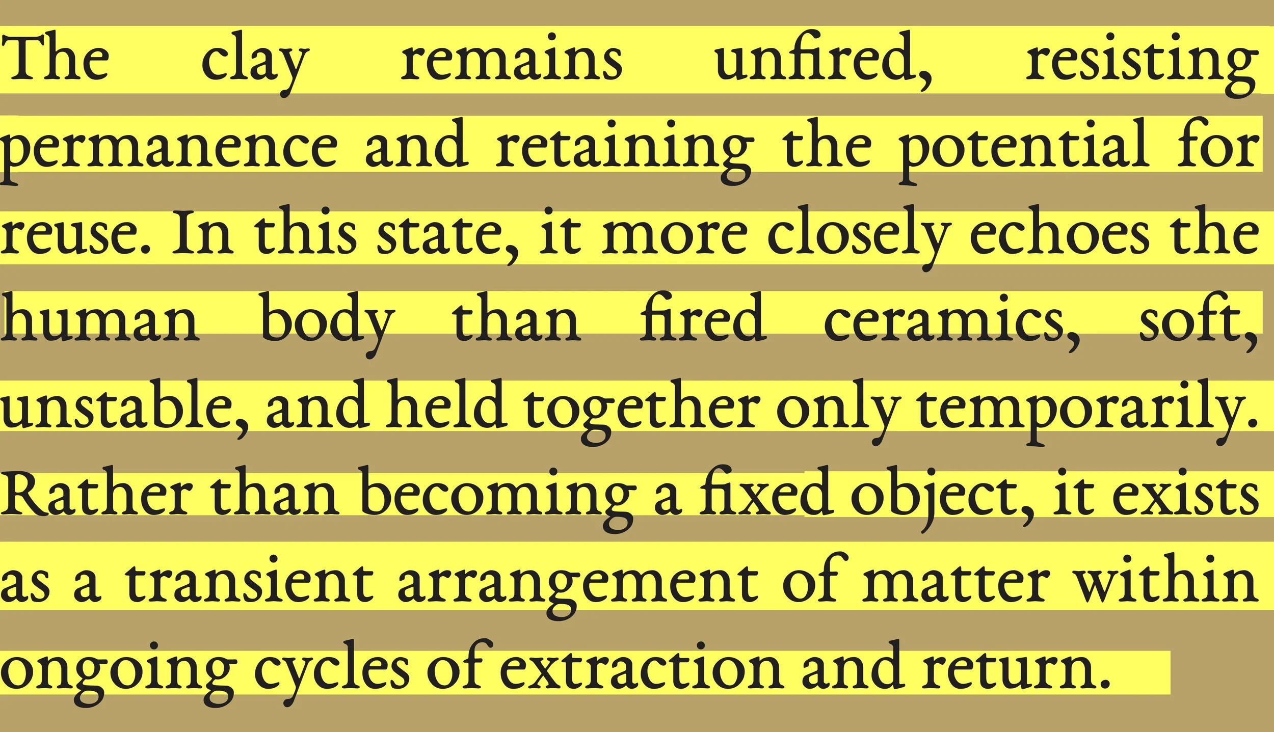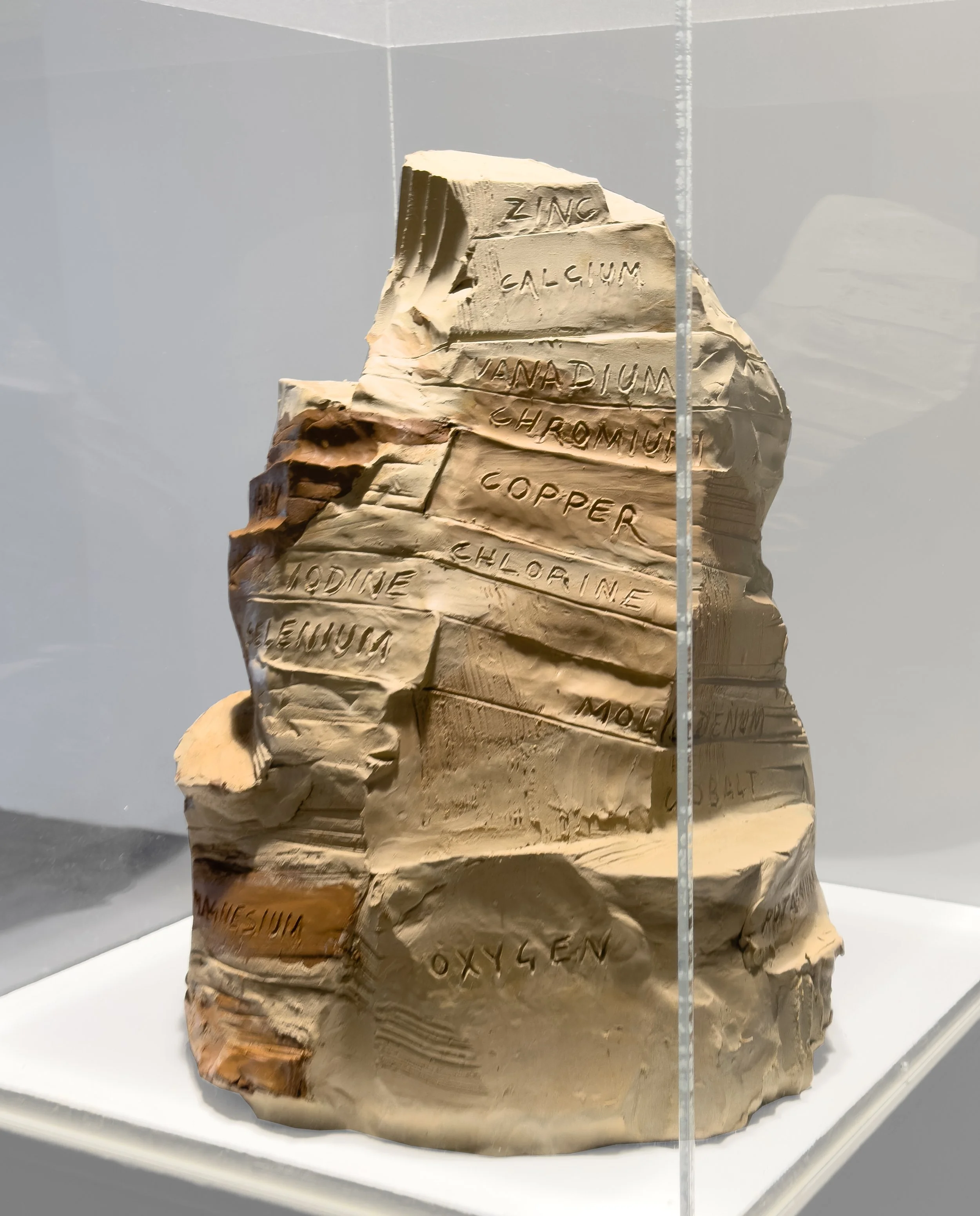 Human Landscape presents the body as a material inventory of elements. Composed of unfired, reclaimed clay and weighing approximately 154 lbs, the work mirrors the mass of a human body while shifting attention to its elemental composition. Labelled with the twenty-five elements that constitute the body, the sculpture reads as both terrain and inventory, collapsing distinctions between figure and landscape.